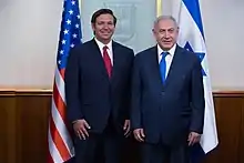 As governor, DeSantis pledged to be "the most pro-Israel governor in America".[24] In light of Airbnb's decision to no longer allow rentals of Israeli settlements in the West Bank, on January 15, 2019, DeSantis directed the Department of Management Services to no longer reimburse state employees and state contractors for travel expenses incurred with Airbnb;[25] later that month he accepted the State Board of Administration's recommendation to place Airbnb on Florida's "Scrutinized Companies List".[26] DeSantis visited Israel – accompanied by Sheldon Adelson, a megadonor to his 2018 gubernatorial campaign – in May to attend a ceremony held by Florida Atlantic University and Ariel University, celebrating the agreement of a plan to exchange and research opportunities between the universities' respective students.[24][27]