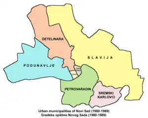 From 1980 to 1989, city was divided into seven urban municipalities: Stari Grad, Podunavlje, Liman, Slavija, Petrovaradin, Detelinara and Sremski Karlovci. In 1989, six of those municipalities were merged into single Municipality of Novi Sad, while municipality of Sremski Karlovci was transformed into separate administrative unit, which is completely independent from Novi Sad. In 2000-2002, the Municipality of Novi Sad was changed to City of Novi Sad and two urban municipalities (Novi Sad and Petrovaradin) were formed within the city. Since 2002, when the new statute of Novi Sad came into effect, City of Novi Sad is divided into 46 local communities. City has its parliament, governing mayor and a city council.