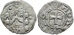 The iconography of many examples, with the legend surrounding a large cross or a bust of the Virgin Mary, follows Western European models rather than those of traditional Byzantine coinage, and most of them do not identify the Byzantine emperor under whom they were struck.[1] They conform, however, to the general type of the widespread tornese coins, with a weight of 0.6–0.8 grams, a diameter of 17 mm and silver content of 0.200–0.250. Initially they were concave but later issues are flat. They apparently form the continuation of the Byzantine tornese issue (known in Greek as tournesion) of Emperor Andronikos II Palaiologos (r. 1282–1328), and like them were probably rated at 96 to the gold hyperpyron.[2] Some bear the name of Andronikos III Palaiologos (r. 1328–1341) and can thus be dated to the 1330s, the anonymous series could be dated to the 1340s (marked by a destructive civil war), and the last issues, featuring John V Palaiologos (r. 1341–1376 and 1379–1391) would date to the 1350s, after which time the type was discontinued.[1] There are a few exceptions however. A politikon currently in the Cabinet des Médailles in Paris weighs 1.4 grams and has a silver content of 0.785, far higher than the ordinary tornese but still below the main Byzantine silver coin, the basilikon. A few others conform to two of the billon politikon types, but are large, thick, and heavy (circa 2 grams) copper coins, whose function is unclear.[3]