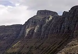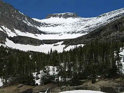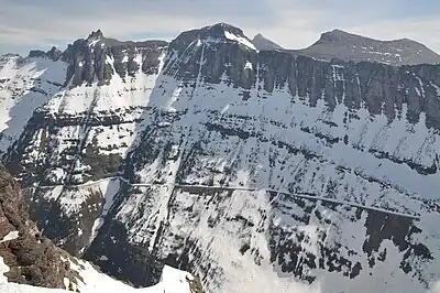 Pollock Mountain (9,195 feet (2,803 m)) is located in the Lewis Range, Glacier National Park in the U.S. state of Montana.[3] Pollock Mountain is situated along the Continental Divide and is one of the peaks along the Garden Wall and is approximately .6 miles (0.97 km) south of Bishops Cap. The mountain was named by Ross Carter for William C. Pollock, a member of the Indian Commission who along with Walter M. Clements and George Bird Grinnell negotiated with the Blackfeet to consummate the treaty that enabled the Federal Government to purchase the "Ceded Strip" of land, which included all of what is now Glacier National Park to the east of the Continental Divide.[4]
