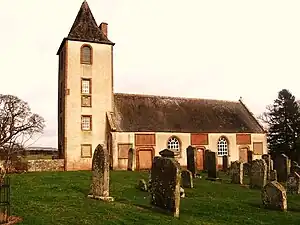 In 1567, Adam Hume, 3rd son of the 4th Baron of Polwarth was the first rector at the church after the Scottish Reformation.[3] Later, in 1683, Sir Patrick Hume was implicated in the Rye House Plot and he hid for four weeks in the crypt at Polwarth Church to escape detection.[4] His daughter, Grizel, later Lady Grizel Baillie took him food during his self-imposed imprisonment.[5] The church was virtually rebuilt in 1703 on the same site as the previous churches and contains parts of the earlier buildings. Polwarth Kirk is protected as a category A listed building: "Prominently sited, well-detailed and surprisingly intact, Polwarth Church remains one of the most significant buildings in the parish and indeed, within Scotland as a whole".[6] The church is built of rubble below a slated roof. The 'T' shape building is highlighted by a four–stage tower, and the interior was extensively renovated in the 20th century. The church also contains the Marchmont family crypt which can be seen through a grille at the bottom of the east wall.[7]