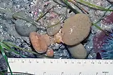| A cluster of colonies of the compound ascidian Polyclinum planum attached to a rock at -1.0 ft MLLW in the intertidal zone at the Hopkins Marine Station, Pacific Grove, California, USA | |