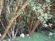 This species is fast growing, and is more ecological and adapts better than other species of the genus. It is a promising candidate for reforestation and agroforestry. This region is cold in the winter but has a dry climate; the herbage consists of various grasses and herbaceous plants, the wild potatoes Solanum acaule and Solanum bukasovii, and the woody shrubs P. racemosa, Mutisia acuminata, Baccharis sp., and Cantua buxifolia, which is the national flower of Peru.[3] In Ecuador it has been introduced from Peru, and this may be detrimental because it hybridises readily with the local species of Polylepis, of which there are eight, including the endemic species Polylepis lanuginosa. The Polyepsis forest plays an important role in the ecosystem of the region, acting as a sponge to retain moisture.[4]