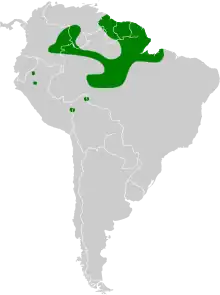 The nominate subspecies of green-tailed goldenthroat is found in the Guianas and north-central Brazil from the lower Negro and Madeira rivers east into the states of Pará and Amapá. P. t. leucorrhous is found from eastern Colombia and southern Venezuela into the upper Negro River area of Brazil, and separately in eastern Peru and northern Bolivia.[3][7] In addition, the South American Classification Committee (SACC) of the American Ornithological Society lists it as hypothetical in Ecuador.[5] The species inhabits the edges of sand-soil forest and sandy savanna with scattered small trees and stands of bushes. In elevation it generally ranges between 100 and 300 m (330 and 980 ft).