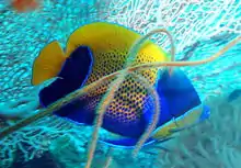 Pomacanthus navarchus, the blue-girdled angelfish or majestic angelfish, is a marine angelfish from the Indo-Pacific region. It occasionally makes its way into the aquarium trade.[3] P. navarchus is one of the smallest of the larger species of angelfish. It grows to a maximum length of 28 centimetres (11 in), but is usually much smaller than this, and can live to be up to 21 years old. Younger fish stay closer to the shallows, but the more mature fish can be found up to 120 feet (37 m) deep. Majestic angelfish eat mainly sponges and tunicates. Juvenile fish are mostly blue in color with white stripes. As they mature, they take on a yellow coloration on the flanks, dorsal fin, and tail.
