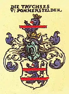Pommersfelden’s arms might heraldically be described thus: Party per fess argent and gules, argent a pale azure, thereon an uppercase T argent and flanked by two embattled towers gules, gules a lion passant Or with two tails armed, langued and crowned azure on a mount of three.