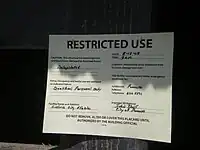 The building is reported to be one of the oldest municipal buildings extant in California.[4] In 2003, the Pomona Historic Preservation Commission recommended recognition of the stables building as a historic landmark,[5][6] and the building was added to the National Register of Historic Places in October 2004. However, the listing of the building has not led to any cessation of the building's deterioration. Located in the middle of a fenced-off yard used by the City of Pomona for storage of municipal vehicles, fuel, and other materials, the building has fallen into a serious state of disrepair and dilapidation. After the July 2008 Chino Hills earthquake, city officials posted a sign (pictured at left) on the entrance to the stables restricting access due to its dilapidated condition. After severe winter rains, the stable walls partially collapsed in 2017. The stables were fully demolished by the city of Pomona in Fall of 2022.