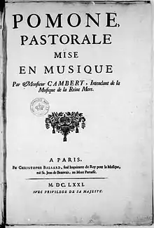 Pomone (Pomona) is a pastoral opera in a prologue and five acts by Robert Cambert with a libretto by Pierre Perrin. It has been described as "effectively the first French opera."[1] It was first performed in Paris at the Jeu de Paume de la Bouteille theatre belonging to Cambert and Perrin's Académie d'Opéra on 3 March 1671. The production had ballets choreographed by Des Brosses[2] and sets and machinery designed by Alexandre de Rieux, marquis de Sourdéac.[3] The novelty of the work drew large audiences and the opera enjoyed 146 performances over the eight months of its run.[4] The score of Pomone has only partially survived.[1]