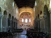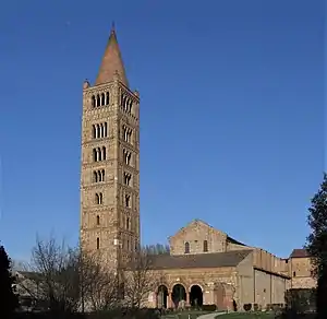 The church of Santa Maria is an example of a triple-nave Ravennan Romanesque-style basilica with arcaded aisles and carpentry rafters, originating in the 7th-9th century, and sequentially enlarged as the abbey grew in power and prestige, attaining its present aspect, with a segmental apse, in the 11th century. The interior contains a 12th-century Cosmatesque and mosaic inlaid stone pavement, and frescoes in the apse by Vitale da Bologna and his assistants;[10] and there are also paintings in the refectory by a Riminese master. The chapter hall has early 14th-century frescoes by a pupil of Giotto.[11]