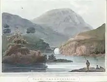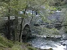 The bridge was perhaps built in the 17th century, then extensively rebuilt and widened in 1795–6. It is Grade II listed.[12] As with many older bridges, folklore had claimed that it was constructed by the Devil or by the Romans (described as "highly dubious" by a National Trust survey); a stone with the marking "W M 1656" scratched on it was found during reconstruction, providing a terminus ante quem.[13][14] Another possibly medieval bridge spans a small stream that is a tributary of the Glasyn nearby.[6]