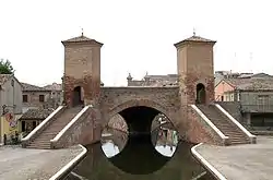 In the 16th century, Comacchio was ruled by the Papal States. Cardinal Giovan Battista Pallotta commissioned the Trepponti bridge as part of the city's renovation, and Capuchin Giovanni Pietro da Lugano constructed it.[3] Comachio had been raided by assailants in the past decades and was left in disrepair. Ravennese architect Luca Danese was tasked with drafting the city's renovation plans and designed the Trepponti bridge as part of its new defensive works.[3][2] The Trepponti bridge would be one of the city's main gates as well as the entryway into its internal canal network.[2] It was completed in 1638.[3]