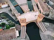 The name Trepponti, originating from the word tre (three) and ponti (bridge) refers to the split in the canal underneath the bridge - however, technically speaking the Trepponti bridge consists of not three but five stone arch bridges, as the Sant'Agostino and San Petro canals that made up the old Comacchio moat also intersect the canal here.[1] The five bridges are connected by a central Istrian stone floor[2] that makes up a small pentagonally-shaped public square, held up by a cross-vaulted ceiling.[1] Five large staircases connect the bridge to the city streets and the fish market below.[3] Two guard towers stand over the bridge's southeastern side. Several columns serve a decorative purpose.[1]
