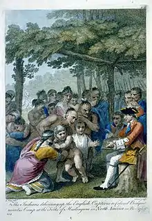Bouquet's negotiations are depicted in this 1765 engraving based on a painting by Benjamin West. The Indian orator holds a belt of wampum, essential for diplomacy in the Eastern Woodlands.