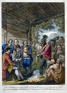 Additional Indian resentment came from Amherst's decision in February 1761 to cut back on gifts given to the Indians. Gift giving had been an integral part of the relationship between the French and the tribes of the pays d'en haut. Following an Indian custom that carried important symbolic meaning, the French gave presents (such as guns, knives, tobacco, and clothing) to village chiefs, who distributed them to their people. The chiefs gained stature this way, enabling them to maintain the alliance with the French.[41] The Indians regarded this as "a necessary part of diplomacy which involved accepting gifts in return for others sharing their lands."[42] Amherst considered this to be bribery that was no longer necessary, especially as he was under pressure to cut expenses after the war. Many Indians regarded this change in policy as an insult and an indication the British looked upon them as conquered people rather than as allies.[43][44][45]
