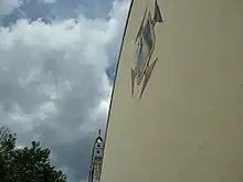 The façade of the chapel at the university's main entrance showing the seal of the university