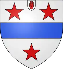 | Arms | Argent a fess azure between three mullets gules |