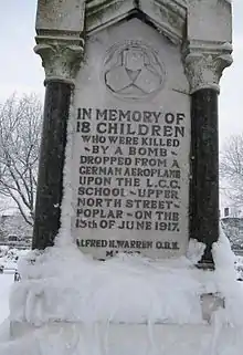 The Poplar Recreation Ground Memorial is a memorial to 18 children killed at Upper North Street School in Poplar on 13 June 1917, by the first daylight bombing attack on London by fixed-wing aircraft.