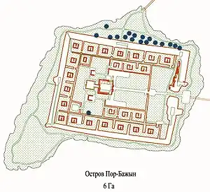The walls of the site enclose a rectangular area of 215 m × 162 m (705 ft × 531 ft), oriented east–west and covering almost the entire island. The interior is taken up by two large yards, a central building complex, and a chain of small yards along the northern, western and southern walls. The western and eastern curtain walls are relatively well preserved. The main gate, with gate towers and ramps leading up to them, is located in the middle of the eastern wall. The curtain (outer) walls have survived up to a maximum height of 10 m (33 ft), the maximum surviving height of the inner walls is 1–1.5 m (3.3–4.9 ft).[1]