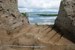 Geophysicists found that the island is essentially a plug of permafrost in a shallow lake. This island seems to have risen from the lake several centuries before the fortress was built on it. The clay for the walls of the fortress may have been taken from the lake bed around the island.[6] Geomorphological fieldwork also revealed traces of at least two earthquakes. The first of these seems to have already happened during the construction of the fortress in the 8th century. In the late Middle Ages, another catastrophic earthquake led to fires and to the collapse of the southern and eastern enclosure walls and of the northwestern corner bastion.[7]