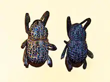 The basic colour is black or brown. The elytra and the pronotum are covered by small glossy tubercles.