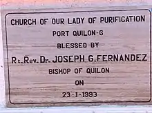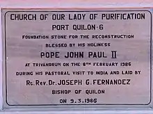 The Pope John XXII designated Kollam (Quilon) as the first diocese in India in 1329 and there was a church called Kollam church before the arrival of the Portuguese in the sixteenth century.[7][8] Later, the Portuguese constructed a number of additional churches in the area, leading to the renaming of Kollam Church as "Port Kollam Church". The Port Kollam parish was also blessed by the visit of Francis Xavier as part of his missionary activities along the Malabar coast.[9][10][11] A new church, constructed in 1912 and dedicated to Our Lady of Purification, stood for more than 70 years, and at the end of the 20th century, a reconstruction plan was started to build the church present today. The foundation stone for the reconstruction was blessed by Pope John Paul II in Thiruvananthapuram on 8 February 1986 during his Apostolic Pilgrimage to India.[12] The church was finally blessed on 23 January 1993 by the Bishop of Kollam, Joseph G. Fernandez.