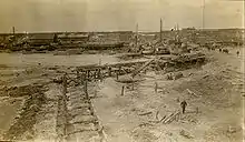 In the winter of 1912-13 the site was surveyed and construction of a wharf began in the spring, followed by buildings and other infrastructure built during the summer. The brand new Canadian research ship CSS Acadia was sent from Halifax to chart the harbour and approaches in the summer of 1913 and 1914. However the whole harbour project was fraught with problems from the start. Material shortages, labour disputes, storms, fires, and boating accidents led to major delays. Another setback was the necessity to completely redesign the harbour because the fast flowing Nelson River was building up silt on both sides of the wharf. Therefore, the harbour was changed to a small man-made island farther out in the river. The island was connected to the mainland with a seventeen-span truss bridge, built by Dominion Bridge Company of Montreal.[1] A wrecked ship currently lies on the island.[12]