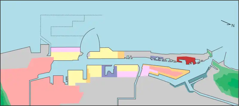 = Industry Area;   = Container Docks;   = Bulk and Sundry Goods Docks;   = Warehouse Exchange Area;   = Fishery Harbor;   = Commercial Area;   = Naval Base