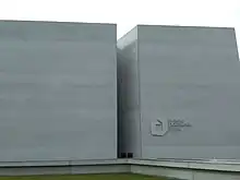 The authors of the project are architects: Arkadiusz Emerla and Maciej Wojda from Cracow studio Ad Artis Architects.[8] Porta Posnania is a complete urban complex which consists of the main building in the shape of a concrete minimalist cube, the 19th cathedral lock (where Śluza Gallery is currently located) and the pedestrian bridge (that connects these two buildings), the amphitheater over the river Cybina, the entrance to the main building in the form of a zigzak, a park with plane trees and concrete benches and a parking for visitors. Inside, the main building is divided into two parts by a long corridor with a glass ceiling. The upper floors of the exhibition are connected by glass bridges. Passing from hall to hall at the exhibition on these bridges, visitors can see through the window the cathedral, which is located on Cathedral Island opposite the Porta Posnania.[9][10][1]