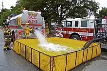 It is primarily used in rural areas where fire hydrants are not available. They are carried on water tenders and are deployed at the scene of a fire during a shuttle operation. A portable water tank is usually set up near or front of an attack engine,[1] or possibly next to a supply engine.[2] This enables tenders to quickly drop off their load of water and return to the fill site as soon as possible. They are designed to be set up in around a half-minute with two firefighters. The engine may then use suction hose to draft the water in the tank.[3]