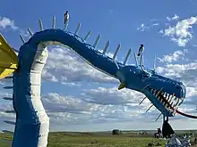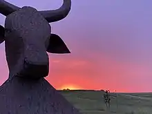 Porter Sculpture Park is located just off Interstate 90 in Montrose, South Dakota (about 25 miles west of Sioux Falls, on the eastern edge of McCook County).[1] It is on the South Dakota Drift Prairie, only 1/4 of a mile off of the interstate. There are over 50 sculptures in the Park which is situated on 10 acres.[2] Many of the sculptures, in the style of industrial art, were made with scrap metal, old farm equipment, or railroad tie plates. The largest sculpture in the park is a 60-foot-tall (18 m) bull head. This sculpture took three years to build, weighs 25 tons, and is equal in size to the heads of Mount Rushmore.[3] Every sculpture in the park was made by Sculptor Wayne Porter. The Park is open May 15 - October 15 annually. Admission is $10 per adult, $5 ages 13–17, and free for ages 12 and under.