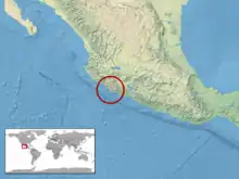 Found in western Mexico (Colima). The type locality given is "on a west-facing slope of the foothills ca. 12 airline km NE of Tecomán, Municipio de Ixlahuacán [= Ixtlahuacán], Colima, Mexico, ... at an elevation of approximately 300 m."[1]