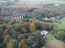 The viaduct was designed and engineered by James Szlumper and William Szlumper, and was contracted to the Pethick Brothers to be built in the late nineteenth century in order to carry the Vale of Glamorgan Railway between Tondu via Coity Junction Bridgend and Barry Docks.[1] Construction started in 1894, but on 18 August 1896 it was observed that No. 9 pier showed signs of settlement and on 20 August, No. 10 also settled. Over the course of three days, No. 9 pier had sunk 4 ft 6 in (1.37 m) and No. 10 had sunk 3 ft 6 in (1.07 m) into the ground, delaying construction as three arches became so distorted that they had to be taken down. Subsequently, Nos. 10 & 12 piers had to be underpinned and No. 11 pier reconstructed.[2] The viaduct was opened on 1 December 1897, but by 16 December it was observed that the embankment at the Barry end was slipping away and had moved pier No. 15 slightly and so Nos. 13, 14 & 15 footings were repacked with stone to stabilise the embankment. However, on 10 January 1898, an indentation in the track above pier No. 13 was observed and traffic was immediately stopped following which, the pier was gradually pushed forward by the embankment and had sunk 13 inches (33 cm).[3] A 2+1⁄2-mile (4 km) loop line diversion was quickly built around the north-west of the valley, whilst repairs and underpinning were entrusted to Price and Wills, builders of the No. 2 dock in Barry.[4] The viaduct eventually reopened on 8 January 1900.[3]