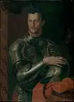 The Portrait of Cosimo I de' Medici is a painting by the Italian artist Agnolo di Cosimo, known as Bronzino, finished in 1545. In his position as court painter for the Medici, Bronzino was author of several portraits of Grand Duke Cosimo I de' Medici. In this portrait, Cosimo is represented in his younger years, commanding and proud; and to quote Giorgio Vasari, "clad with white armor and a hand over the helmet". It has been identified as having been painted in the Medicis' Villa of Poggio a Caiano in 1545.