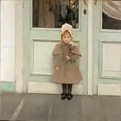 Jeanne Kéfer is depicted standing on a porch before a closed door with her thumb catching the edge of her bow as she reaches into her coat. The portrait symbolizes the child's vulnerability and uncertainty in facing the outside world. The message is emphasized by the composition itself as the Jeanne's body is framed against the adult-sized door.[5]