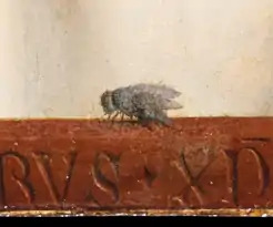 Portrait of a Carthusian sports a trompe-l'œil fly on the center of its trompe-l'œil lower frame. The addition of trompe-l'œil flies to works of art is believed to have begun in the 15th century, right as Christus became active. Art Historians are generally split between two different interpretations of their use. Many art historians believe the fly to hold religious symbolism, functions as connotations of sin, corruption, mortality, etc.[4] Art historians believe that a fly was used to evoke such images in connection with Satan’s moniker Beelzebub—the Lord of the Flies. More recently, art historians are beginning to view the inclusion of trompe-l'œil flies as a professional calling card, with art historian Felix Thülemann describing it as “a selfconscious representation of superior painterly prowess.[5] It is believed that this is why the fly generally appears next to the artist’s signature[4] (the fly’s position right next to ‘Petrus ΧΡΙ Me Fecit’ hinting that the fly might be the referent of ‘me’ rather than the painting.)