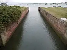 Some visible remains of the Portsea Section still exist in 2011. A section of the Portsmouth-London mainline railway follows the course of the canal between Portsmouth & Southsea and Fratton stations. Beyond them Goldsmith avenue was constructed along the line of the canal.[15] Off Goldsmith Avenue, the east-west route of the canal can still be traced by more recent residential development along Old Canal and Towpath Mead roads. The tow-path follows the course of the foot-path just north of the caravan site and allotments on the south side of Locksway Road at its easternmost end, with the canal to the north side of this. There is evidence that the canal was filled in here with coke from the local gas works. The remains of the lock into Langstone Harbour are also still in evidence.[16] The lock has been a conservation area since 1977 and is a grade II listed structure.[16] In 1979 Portsmouth City Council agreed to spend £35,000 over the next decade to refurbish the lock.[17]