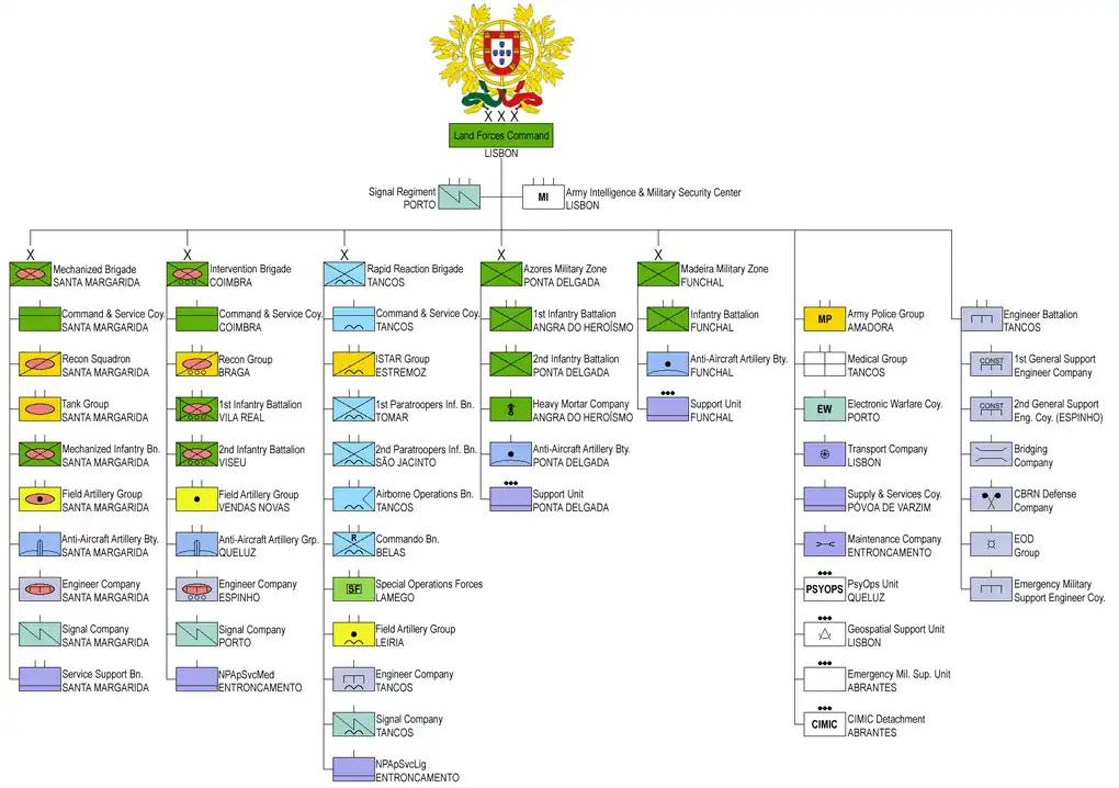 Location of the main Army base units in Continental Portugal. Off-map to west are RG1 and RG2 (Azores) and RG3 (Madeira). Colors represent:
