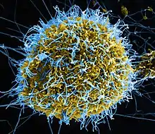 | Ebola virus particles (blue) attacking a cell (yellow) | |