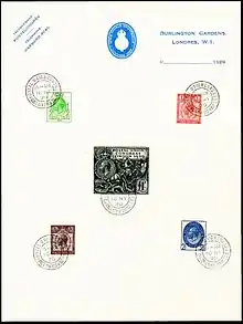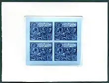 In addition, a separate printing in blue was made at an exhibition of old printing techniques at the London Guildhall Art Gallery by Enschede, also in blocks of four. Fifty imperforate blocks were printed on roughly torn paper which were sold to the public.[8][9]