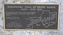 2 miles (3.2 km) north of Rochester, on September 4, 1838, the Potawatomi passed through Chippeway village on the Tippecanoe River, on the Michigan Road (Old US 31). About 50 who were severely ill were left here with their attendants; most joined the caravan later, but some escaped.[71] On September 5, they marched down Rochester's Main Street, and camped at Mud Creek, north of Fulton.[72] Historical markers include a boulder with metal plaque, erected in 1922 by Manitou Chapter of the Daughters of American Revolution;[70] and a memorial to Father Benjamin Petit, erected at the Fulton County Museum in Rochester.