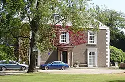 Poulton Hall has been the home of the Poulton Lancelyn family since the 12th century.[1] In the 16th century their surname became Lancelyn Green (or Greene) when Elizabeth Lancelyn married Randle Greene of Congleton.[2] It has been alleged that a castle existed on the site, but there is now no reliable evidence of earthworks or a castle.[1] The present hall dates from 1653, and it was extended to the rear in 1720 when Revd Robert Green added a library. In 1840 a larger addition was made, consisting of a dining room and service wing, and a billiard room containing a pipe organ was built to the left of this in the 1880s.[2]