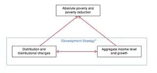 The Poverty-Growth-Inequality Triangle model implies that reducing poverty requires a combination of country-wide policies focused on growth and country-wide policies focused on reducing inequality. Development strategies that focus on only one of these miss opportunities to reduce absolute poverty. The model describes that a change in inequality affects absolute poverty in two ways. First, a change in relative poverty affects absolute poverty by immediately changing the number of people below the poverty line. Second, a change in relative poverty changes the growth elasticity of poverty. A redistribution of income means more poverty reduction for a given amount of growth. The consequence of this is that policies that focus only on growth without considering distribution limit poverty reduction in two ways.[7][8] Economists theorize that for this reason sub-Saharan Africa and other less developed countries will not be able to meet poverty goals like the Millennium Development Goals through growth alone.[9]