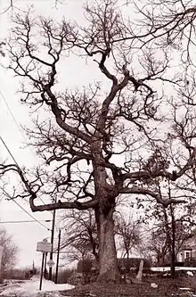 In May 1931, the Molly Varnum Chapter of the Massachusetts Daughters of the American Revolution (DAR) erected a sign next to the tree to commemorate the ancient oak, the Wamesit Indians, and the local militia who passed by it while traveling through that Lowell neighborhood (then still part of the town of Tewksbury) during the Revolutionary War.[1][2]