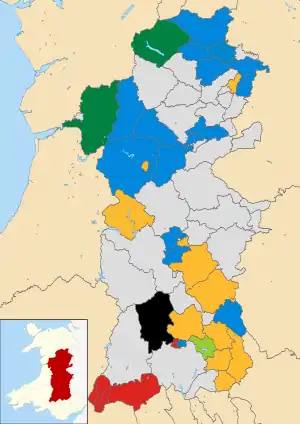 ![]() Map of the results of the 2017 Powys County Council election. Yscir (in black) initially received no nominations and was therefore vacant after the election, it was later won by the Conservatives. | |||||||||||||||||||||||||||||||||||||||||||||||||||||||||||||||||||||||||||||||||||||||||||||