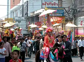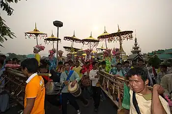 In neighbouring Thailand, where Shan immigrants have brought over the traditions from Myanmar, the ceremony goes on for three days, as the boys (dressed like princes in imitation of Gautama Buddha, who was himself a prince before setting out on the religious path) spend the entire time being carried around on the shoulders of their older male relatives. On the third day, they are ordained, and enter the monastery for a period of at least one week, and perhaps many years.[1]