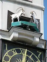 However, in his absence, the leg fell into the fire and burned to the coal. The terrified boy ran to a nearby meadow where the inhabitants of the city kept their animals. From there, he kidnapped two goats and took them to the town hall kitchen. The goats, however, escaped from the boy to the cornice of the town hall tower. There, in front of the gathered townsmen, two small white goats started butting. This sight amused the voivode and the invited guests. The mayor pardoned Pietrek, and the watchmaker was ordered to make a mechanism that would activate the clock goats every day. Since then, every day the trumpeter plays the bugle call and two buzzing goats show up.[5]