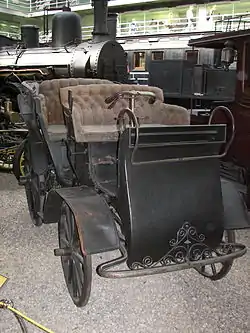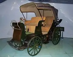 The Präsident was an automobile manufactured by the Nesselsdorfer Wagenbau-Fabriks-Gesellschaft (Nesselsdorf or NW), now Tatra, in 1897. It was the first practical, factory-produced petrol engine automobile built in Central and Eastern Europe[4] (Siegfried Marcus's earlier cars were experimental and not practical). It was constructed by Leopold Sviták and Hans Ledwinka. The automobile was more of a carriage without horses than a car in modern sense. The car is steered via handlebars (while most of the cars of the era had a tiller). The wooden bodywork is placed on an iron frame. It has four seats and a convertible top that would cover only the rear seats. Both axles have suspension of semi-elliptical leaf springs. The wheels were similar to the ones of a horse carriage, but had rubber tyres. The car had a two cylinder spark ignition Benz engine placed by the rear axle.
