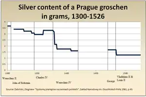 The Prague groschen (Czech: pražský groš, Latin: grossi pragenses, German: Prager Groschen, Polish: grosz praski) was a groschen-type silver coin that was issued by Wenceslaus II of Bohemia since 1300 in the Kingdom of Bohemia and became very common throughout Medieval Central Europe.