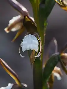 Prasophyllum brevilabre, commonly known as short-lip leek orchid,[2] is a species of orchid endemic to south-eastern Australia. It has a single tubular, green leaf and up to thirty small, greenish-brown flowers with a white labellum. The labellum is sharply turned back on itself so that its tip almost reaches its base.