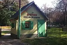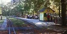 Situated within the Prater amusement park, this station (English: Prater Central Station) is the headquarters of the railway. Facilities include a large staff room, a ticket office, facilities for coaling and watering steam locomotives, and (nearby) the main railway depot comprising a three-road steam shed, and a large carriage shed which doubles as a home for the diesel locomotives. There are two platforms, both on the 'outside' of the balloon loop, and effectively forming two stations (sometimes referred to as Prater Arrival and Prater Departure). For most of its history the railway has required passengers to alight at one platform, and board at the other, as a means of passenger control. However, this practice has been gradually phased out in the early years of the twenty-first century, and had ended by 2011. The former 'arrival' platform is now largely disused, but still in place and maintained for use at special events.